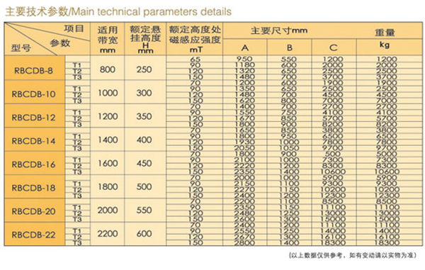 在甲烷爆炸性氣體的場(chǎng)所與帶式輸送機(jī)配合使用,適合帶速高、料層厚、環(huán)境惡劣的帶式輸送機(jī)上除鐵。